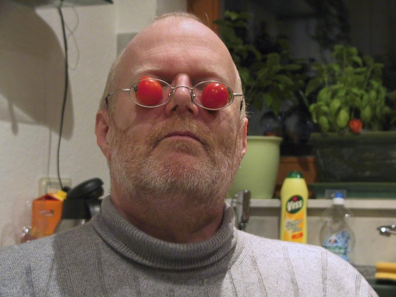 werden kann. Er hat dazu eine Schpezialbrille, die fahindert, dass die Tomaten
