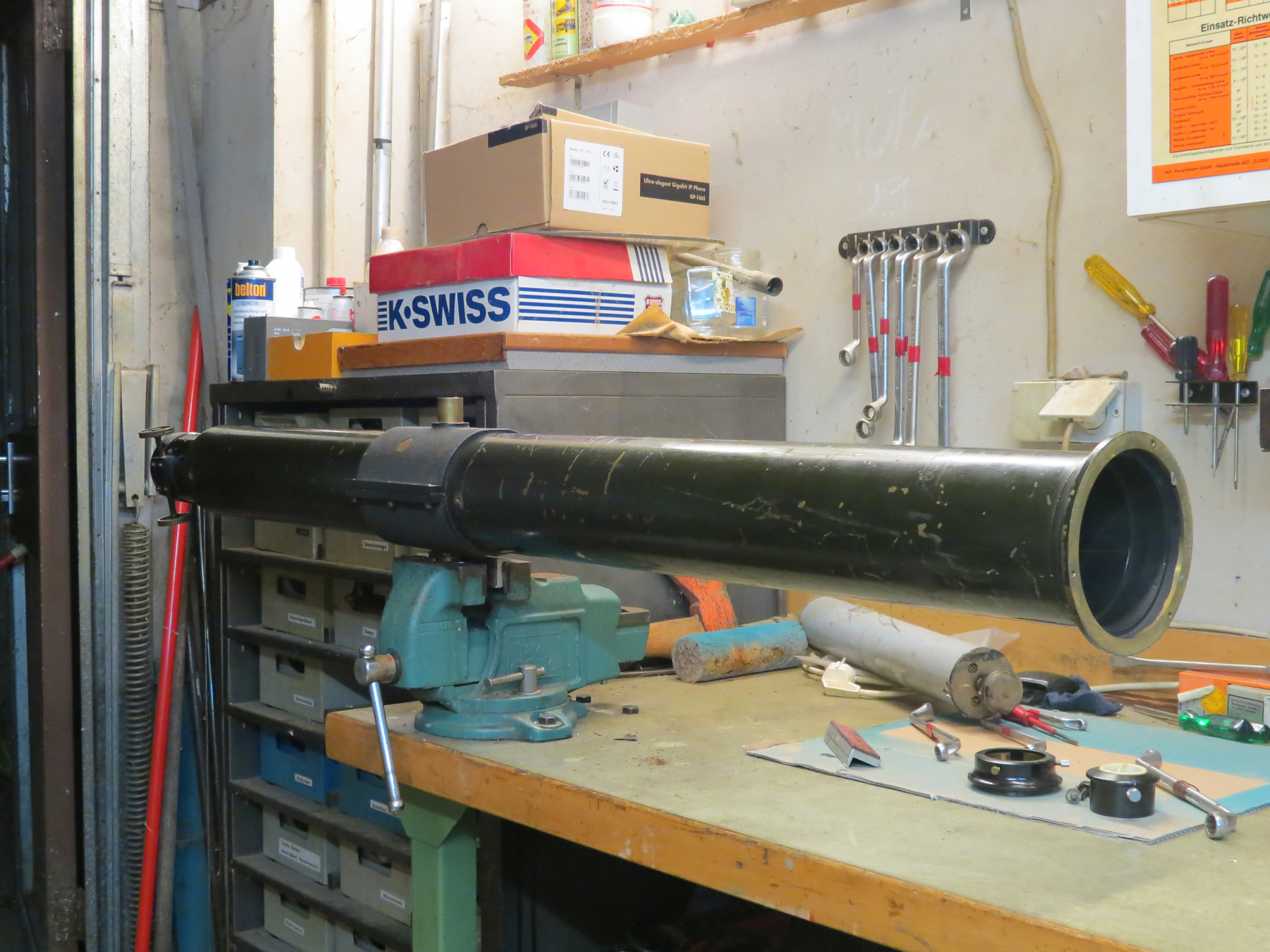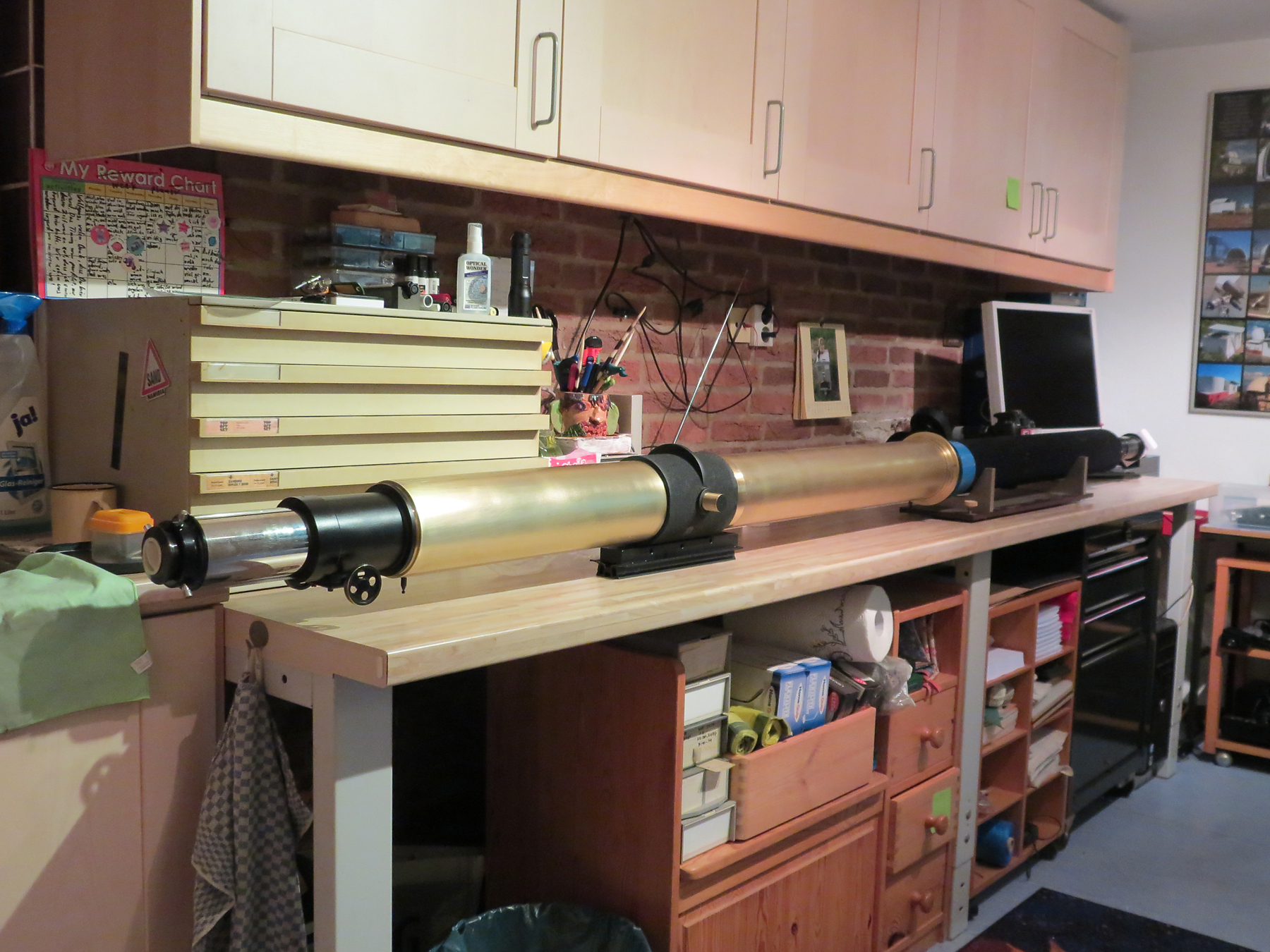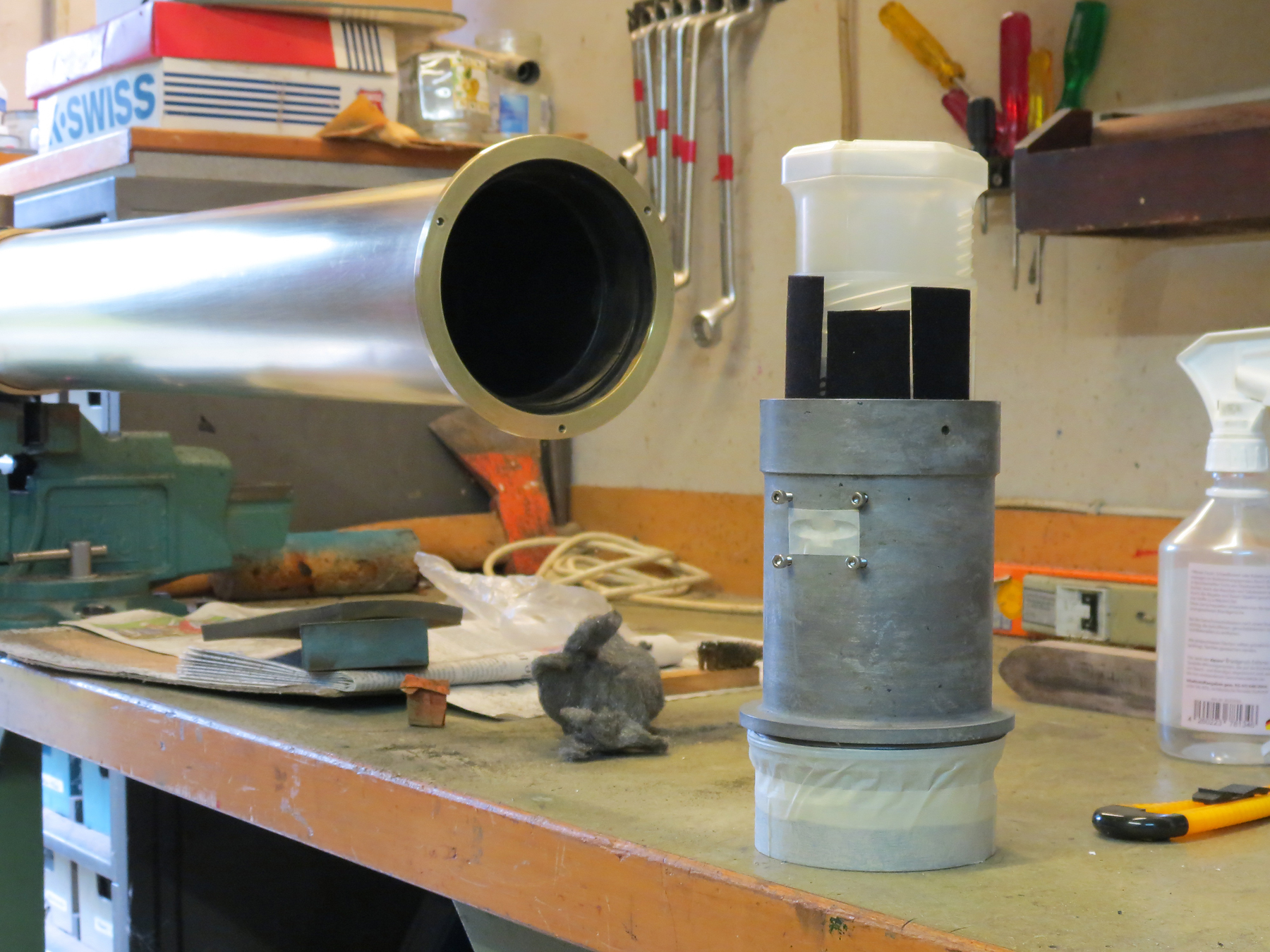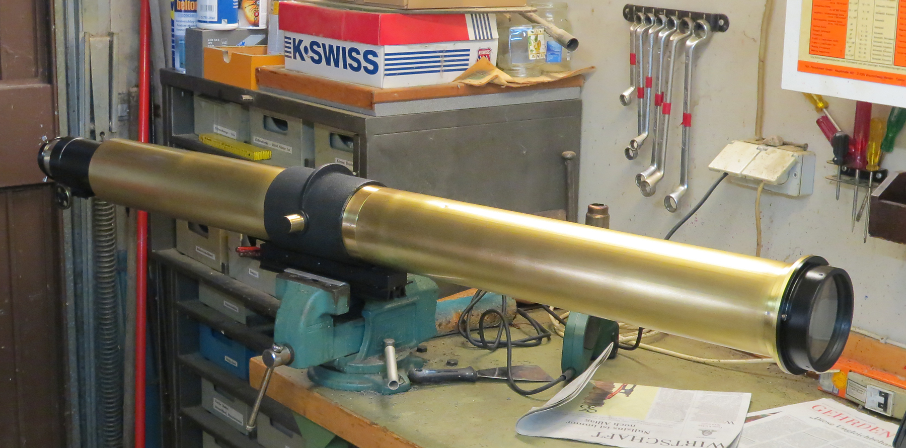 Das Kollimationsfernrohr (rechs) ist ein 4" - f:10 Lichtenknecker AK Objektiv. Es ist Dieter Lichterknecker erstes,