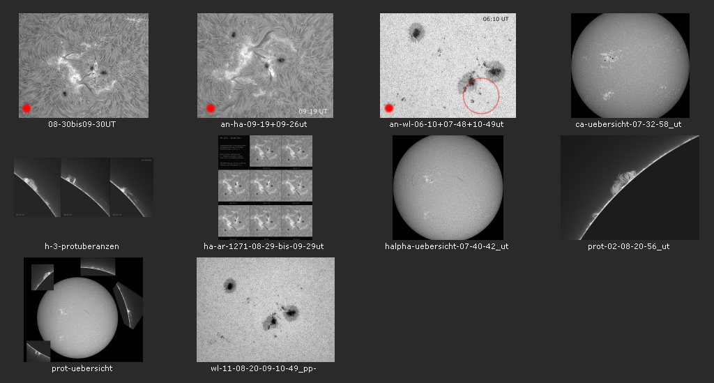 ALLE Vorschaubilder lassen sich durch Anklicken als großes Bild laden, welches jeweils in einem separaten Browserfenster geöffnet wird. Aufnahmekameras waren eine DMK31, DMK 41 und eine Celestron Skyris 445. Die .avifiles bestehen aus jeweils 2000 Rohbildern, von denen 10% gestackt wurden. Animierte Bewegungsabläufe (Zeitraffer) sind in den Vorschaubildern mit einem roten Punkt markiert. |